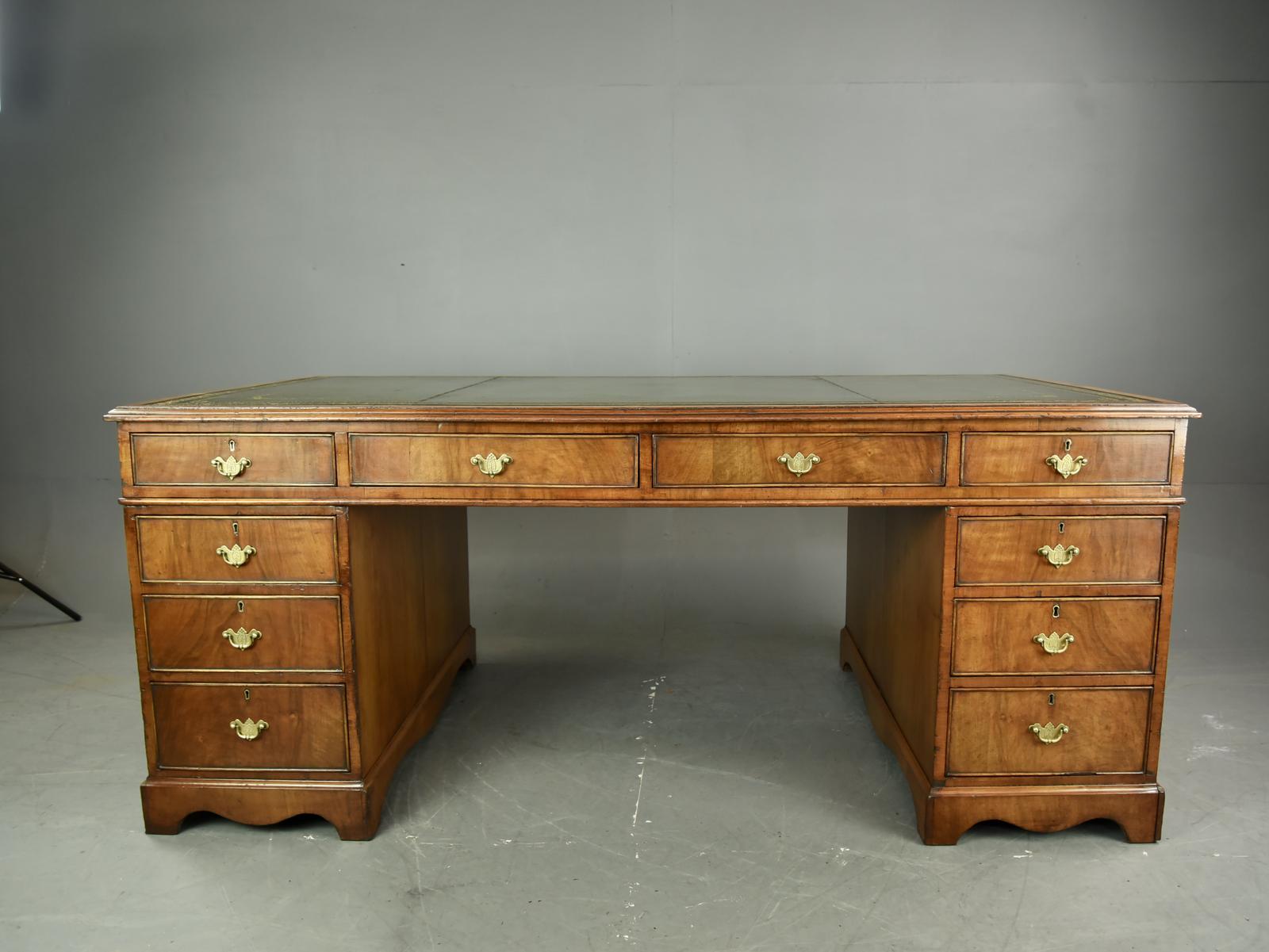 The desk has ten drawers to one side and 4 drawers and cupboard to the opposing side.