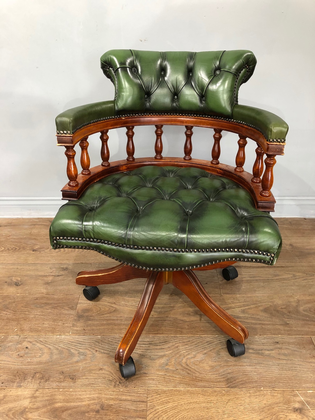 Fine Quality leather captains chair in great condition with rips or holes standing on original castors ,the chair swivals and is height adjustable