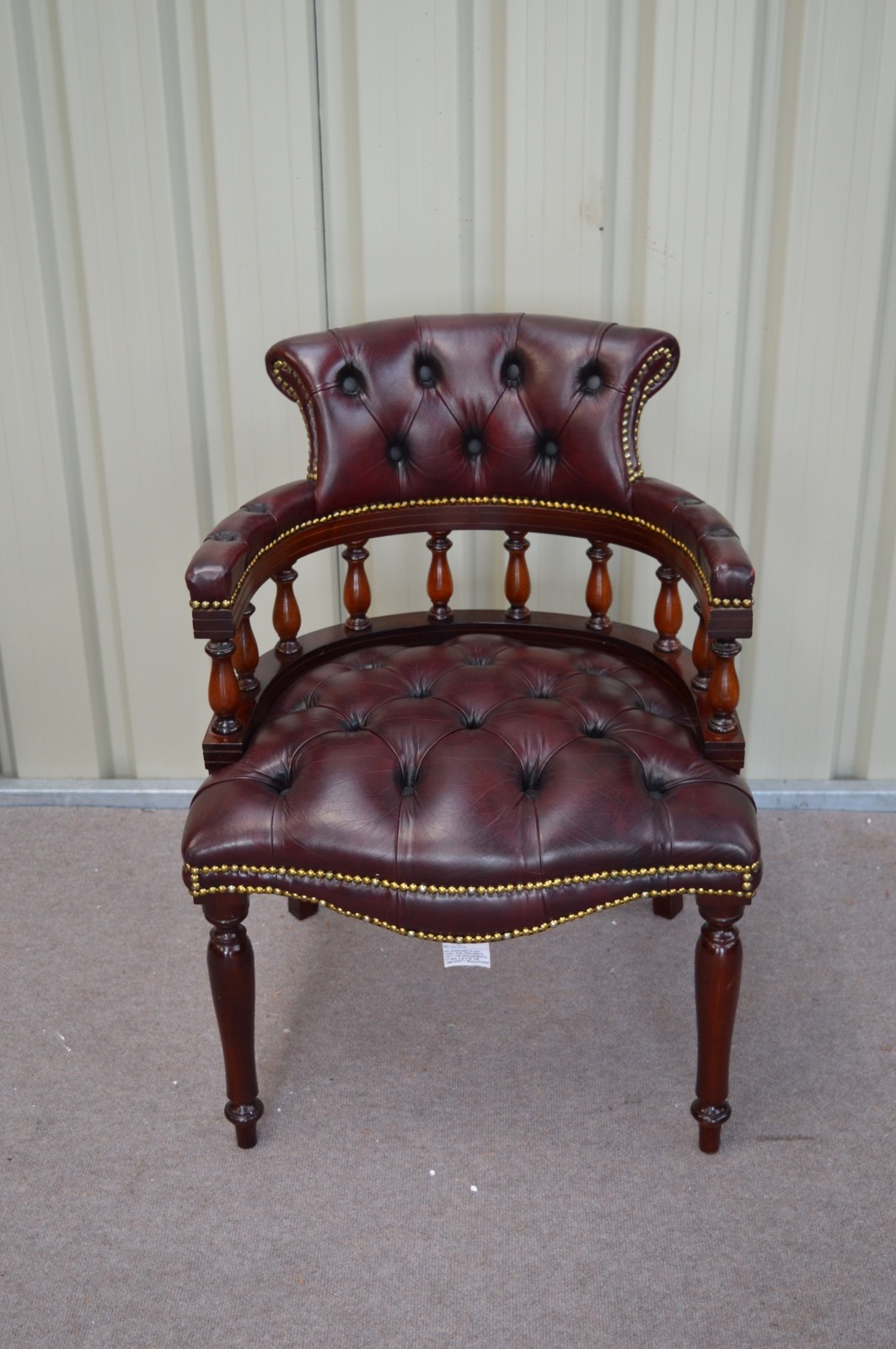 This is a leather studded captains chair in great condition with no rips or buttons missing great claret colour.
