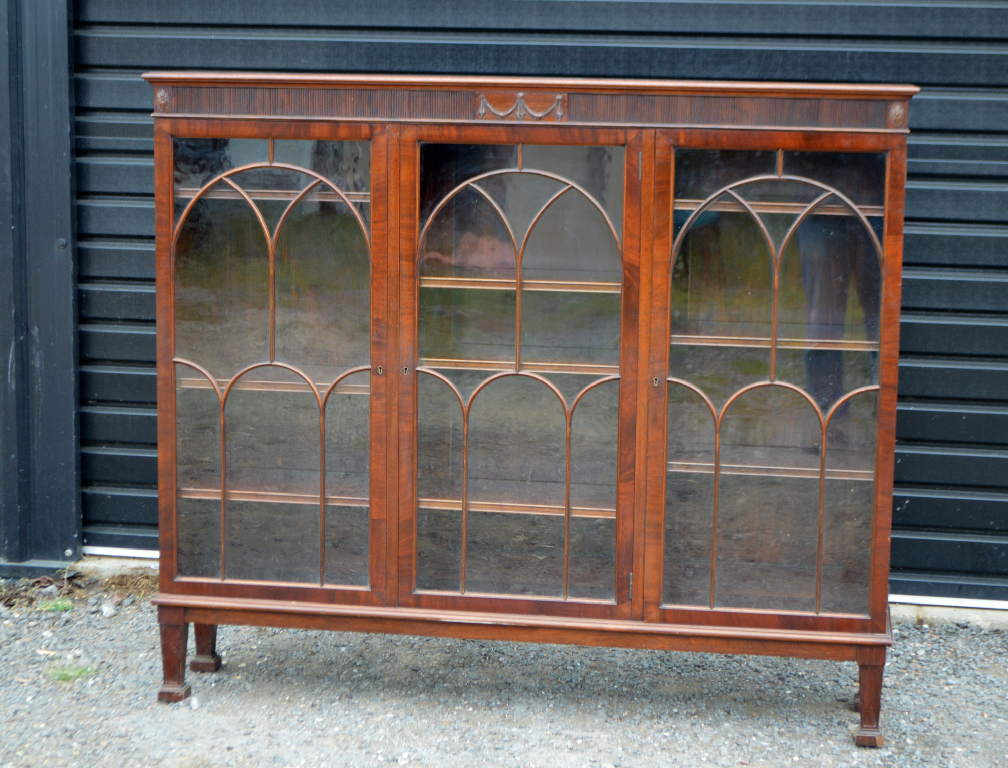 It has nine fully adjustable shelves ,The bookcase is constructed of solid mahogany through out and is of the highest quality . i am able to fid a makers label but it is a typical waring and gillows quality and style . .