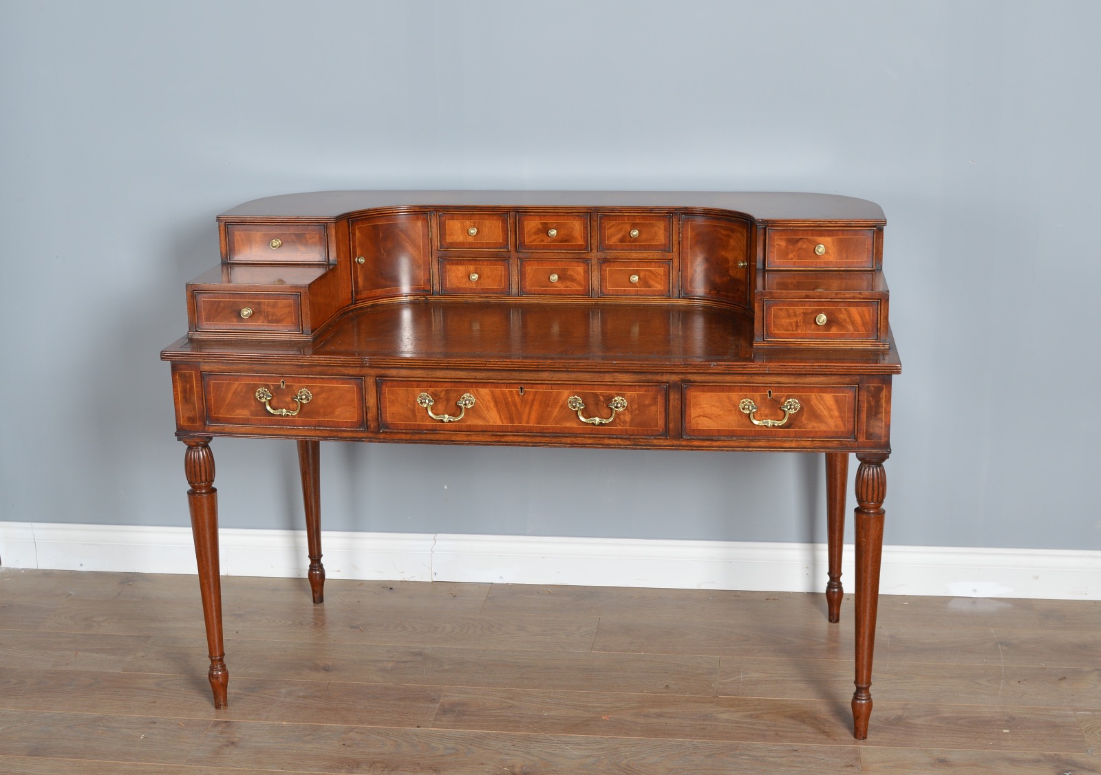 Fine quality mahogany carlton house desk which has a wonderful oak lined hand dovetailed drawers that all slide nice and smooth as they should. It retains its original tan leather insert that has obtained a fine distressed patina over the years. There is a single key that fits all locks.