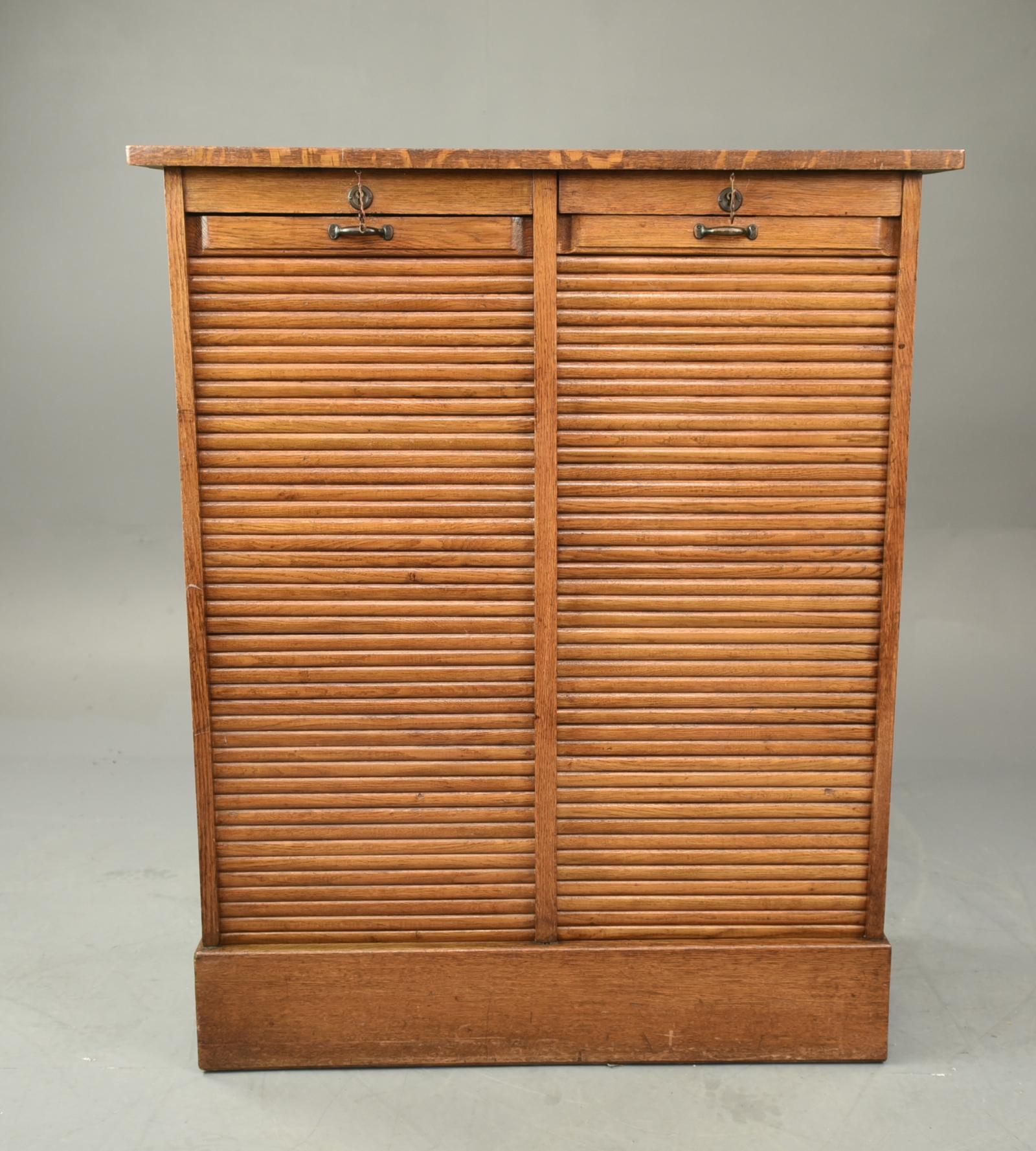 This is a fine quality vintage oak double fronted tambour filing cabinet which remains in very good condition with 18 slide out a4 size trays. Both tambours run smoothly with no damage with workings and two keys supplied. The cabinet is in very good original condition as photographed.