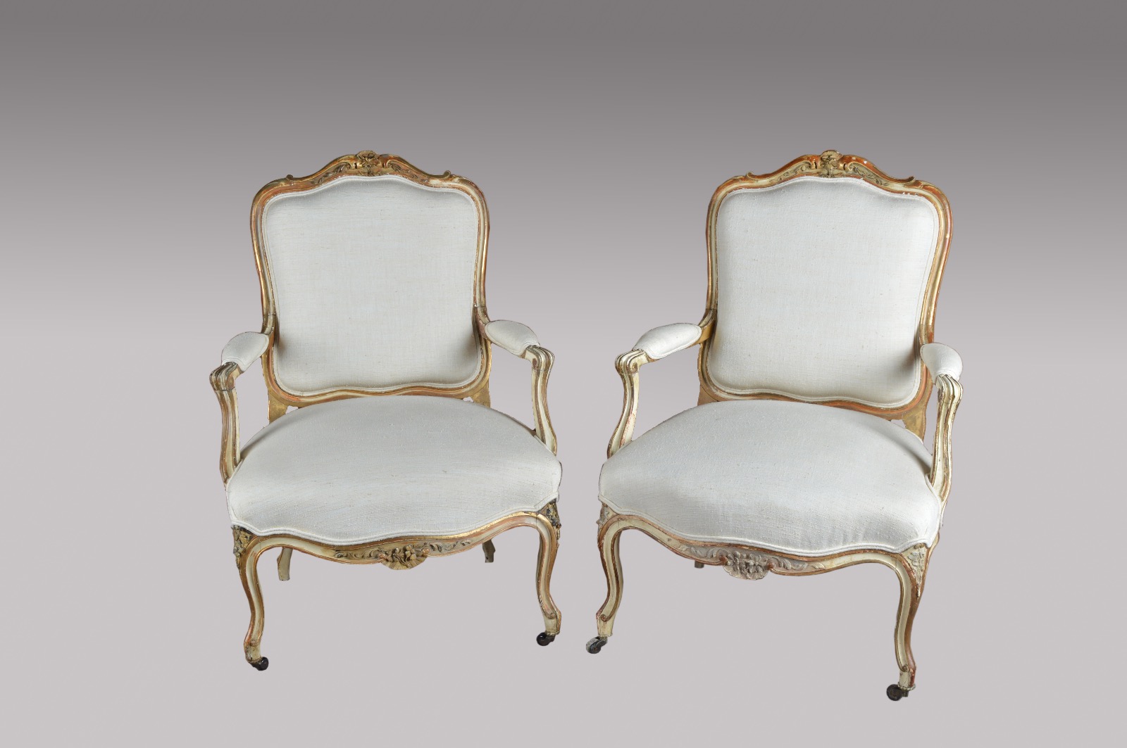 Fine pair of mid 19th century French painted Fauteuils. They are in great condition and retain their original paint that has worn nicely over the many years of use to give a wonderful patina that only age can truly achieve. They have been recently upholstered which is clean with no stains or odours. The chairs have original casters fitted to the front carved cabriole legs. The frames are very solid and woodworm Free.