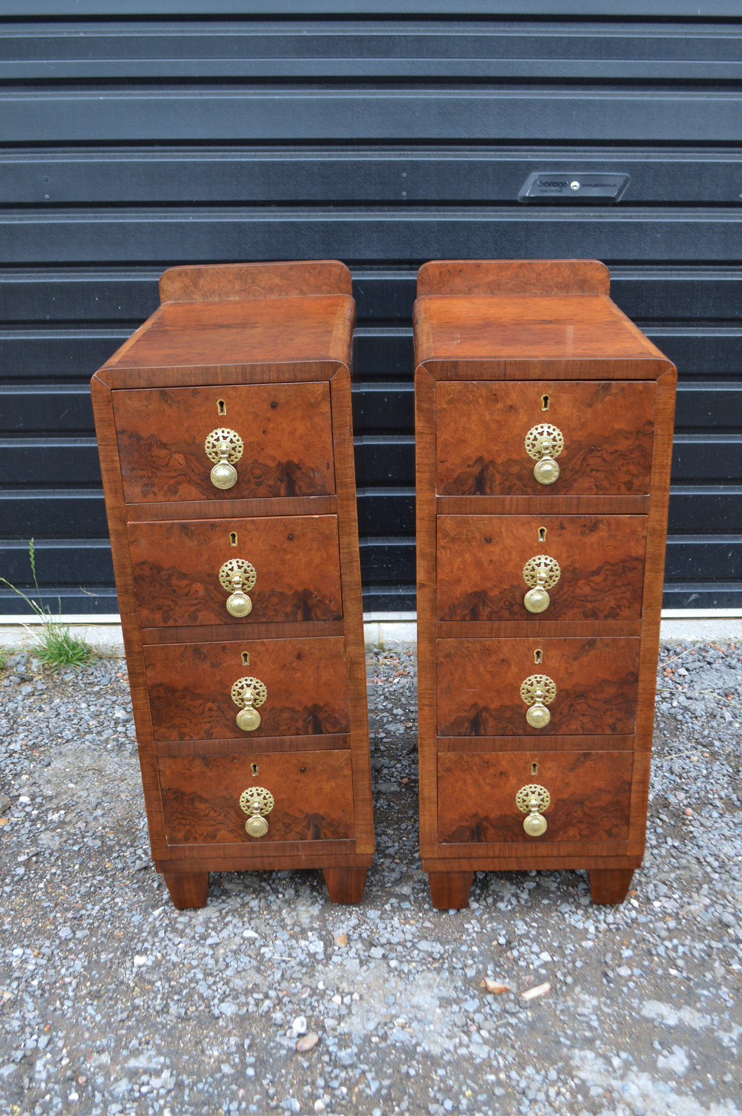 On offer for sale are these fine pair of Art Deco walnut bedside chests of drawers , they are constructed of solid wood throughout with fine hand dovetailed drawers and superb burl walnut grain. All drawer open and close nice and smooth as they should, both bedsides have been fully restored to a very high standard ready for use.