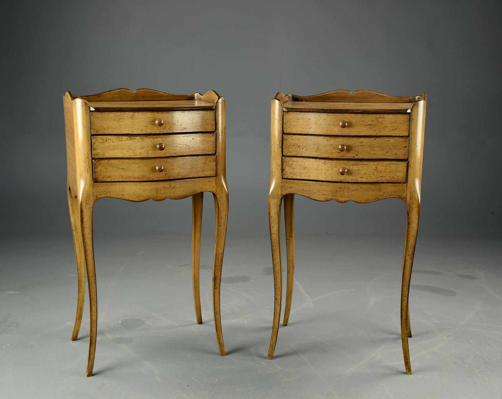 Good quality pair of small French bedside chests of drawers / lamp tables. They are in great condition each with three drawers standing on very elegant cabriole legs. They have a wonderful Antique patina cleaned and ready for their new home
