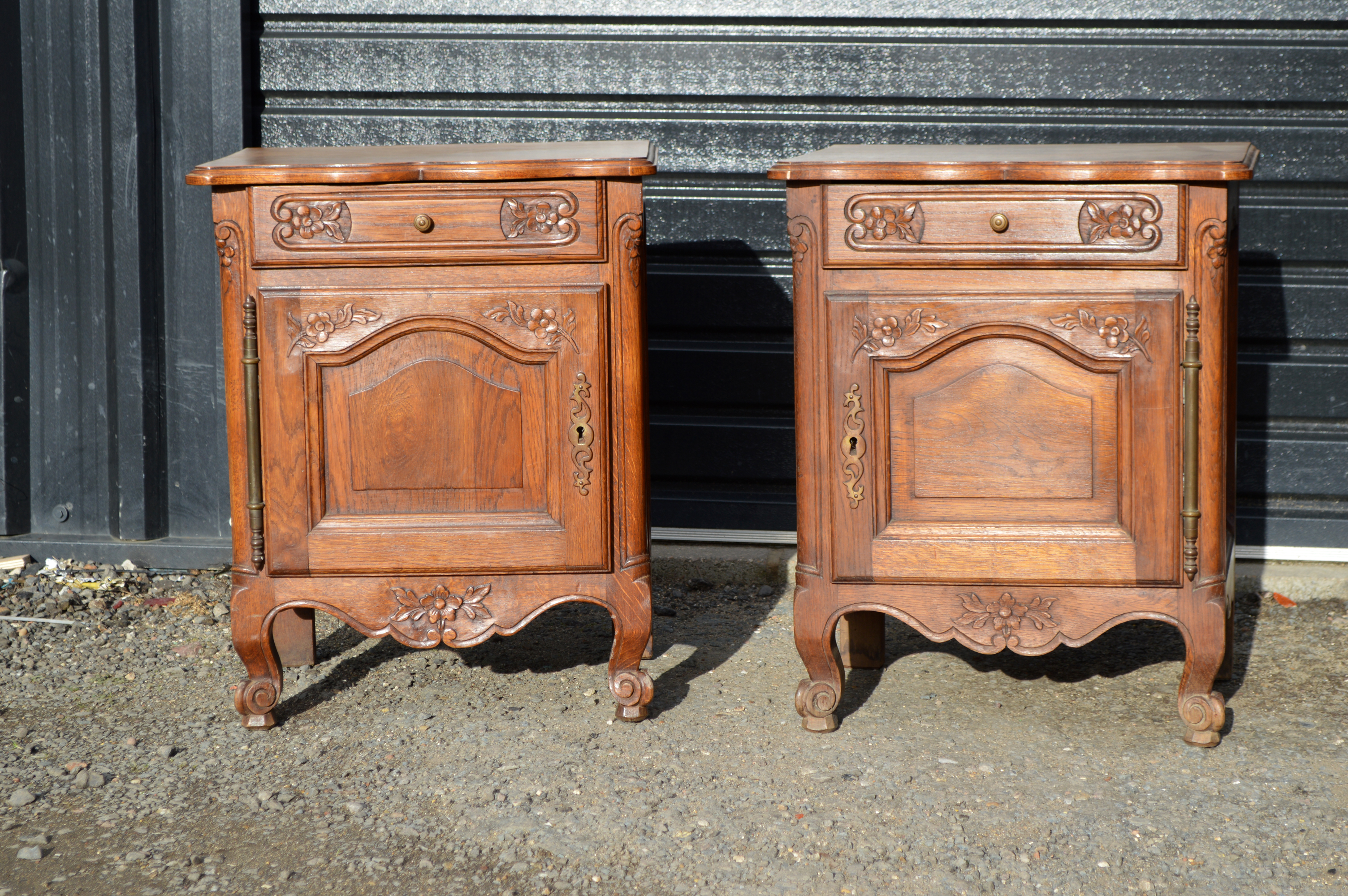 On offer for sale are these good quality French oak bedside cabinets. Both cabinets are in very good condition with no woodworm or damage, the cabinets have wonderful carved detailing with a single drawer and a cupboard below with typical over sized barrel hinge doors there is a single key that fits both cabinets, they are a good practical.