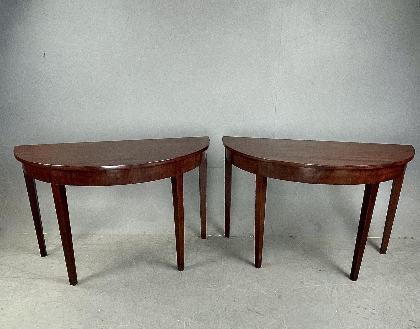 Pair of 18th Century (c.1780) Georgian antique mahogany demi-lune console tables that have quality solid mahogany tops and they stand on mahogany tapered legs. They have been fully restored and are in very good condition. Both tables are woodworm free and stand very solid with no wobbles.