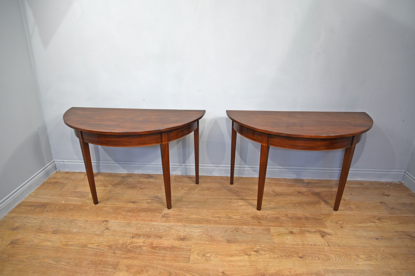 These are a fine pair of 18th Century Georgian antique mahogany console tables / demi lune tables are in great condition with wonderful full grained solid mahogany tops. They have mahogany tapered legs with line inlay detail.