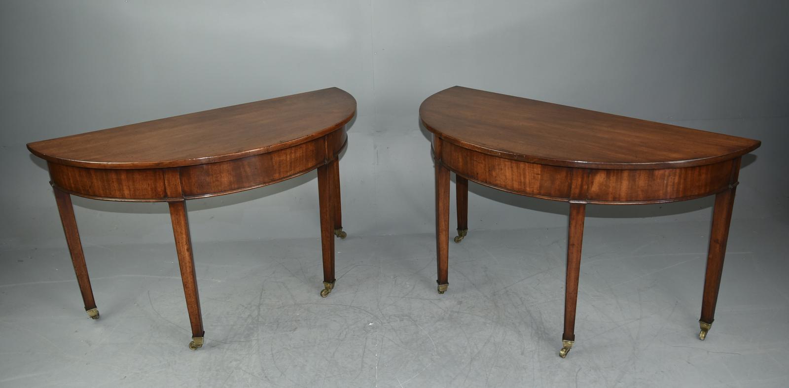 Fine quality pair of 18th Century Georgian antique mahogany demi-lune console tables that are constructed of solid mahogany through out with the Tops having a wonderful grain and colour. They stand on elegant square tapers legs terminating with original brass castors.