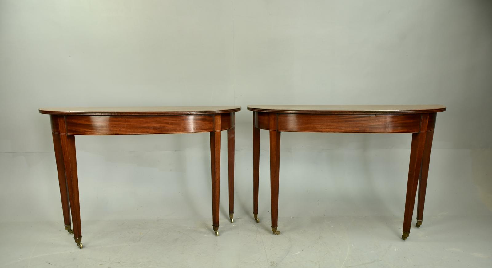 Fine pair of 18th Century (c.1790) Georgian antique solid mahogany D end console/ hall tables that are constructed of solid mahogany with well figured mahogany tops. They stand stand on four square tapered legs terminating in square cup brass castors (all original).