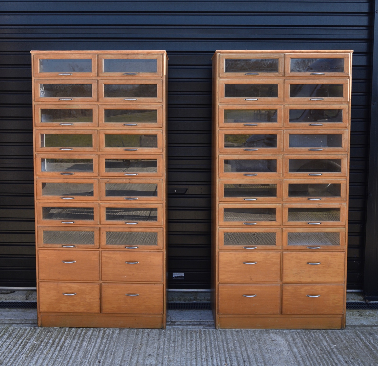 Pair of Vintage Haberdashery cabinets with 20 drawers in each all glass is intact and all drawers slide as they should .