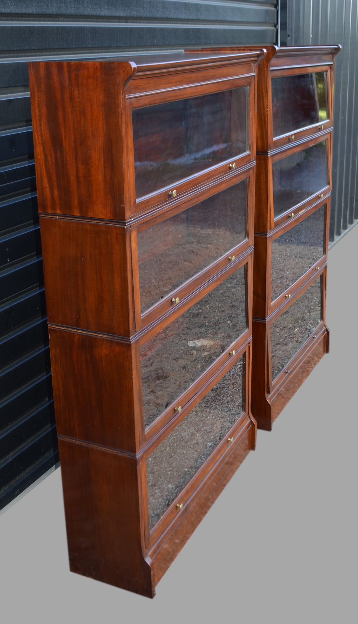 The bookcases are in 4 sections each these comprise of 2 sections 11 inches high and 2 sections 9 1/2 inches in height and 8 1/2 inches in depth, (these are the internal measurements of each section) The bookcases all have the up and slide doors typical of Globe wernicke, in my opinion I would say these bookcases are a far superior quality to Globe Wernicke.