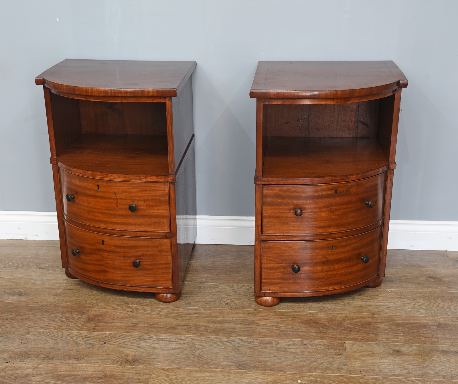 fine pair of unusual mid victorian mahogany bedside chests of drawers both are in great condition with two bow fronted drawers and shelf above.