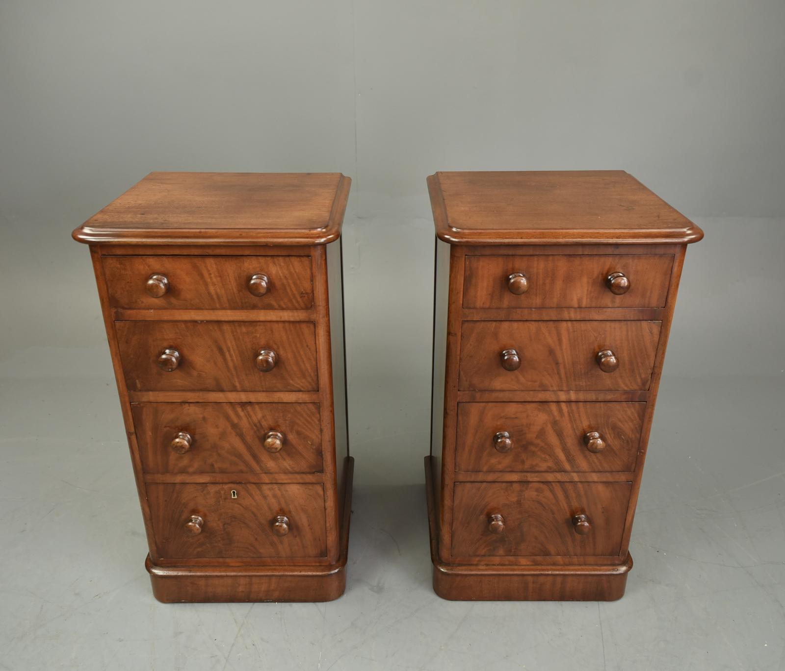 Fine quality pair of Victorian flame mahogany bedside chests of drawers. The chests are in great condition with a great colour and grain. Each chest has four graduating drawers that are hand dovetailed with quality ash linings. The bottom drawer of one chest has a working lock and a single key. The chests have very good proportions and stand very well.