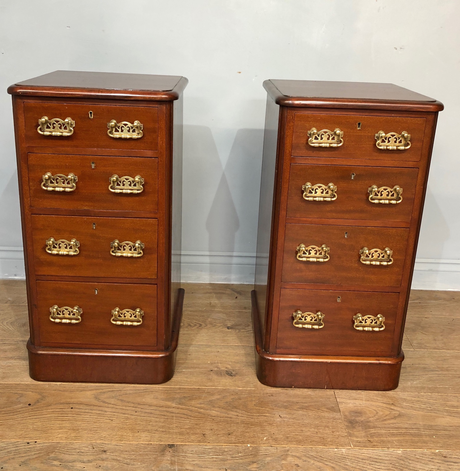 Pair of 19th Century Victorian antique mahogany bedside chests of drawers, each with four drawers. The chests are in very good condition with no damage marks or woodworm. They have been fully restored and French polished in our workshop to a high standard. All drawers slide nice and smooth as they should and come with a single key for all locks.
