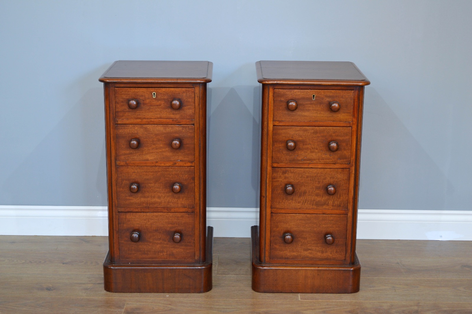 These are a fine pair of Victorian antique mahogany bedside chest of drawers. They are solid mahogany through out with mahogany drawer linings, all drawers slide nice and smooth as they should and there is a single key for the top drawer locks.