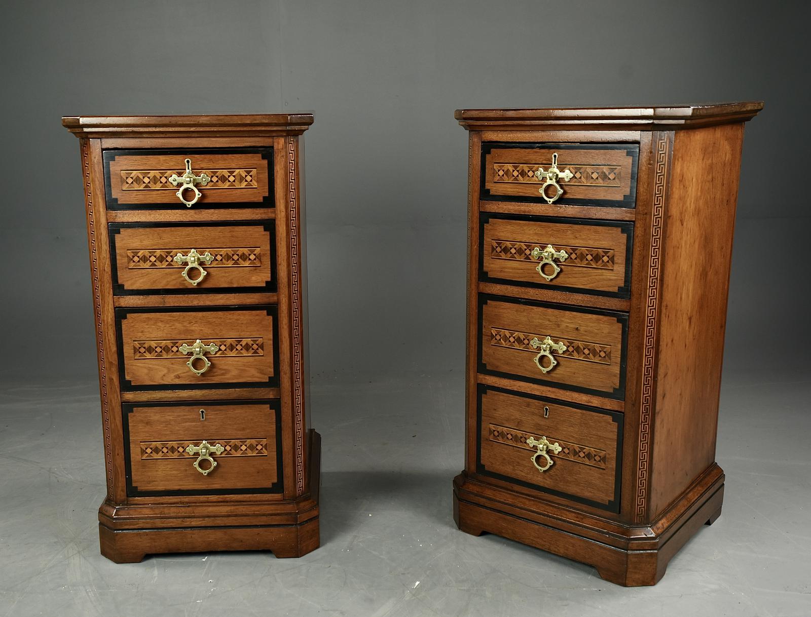 Here we have a very fine pair of late Victorian walnut inlaid pair of Arts and Crafts bedside chests.