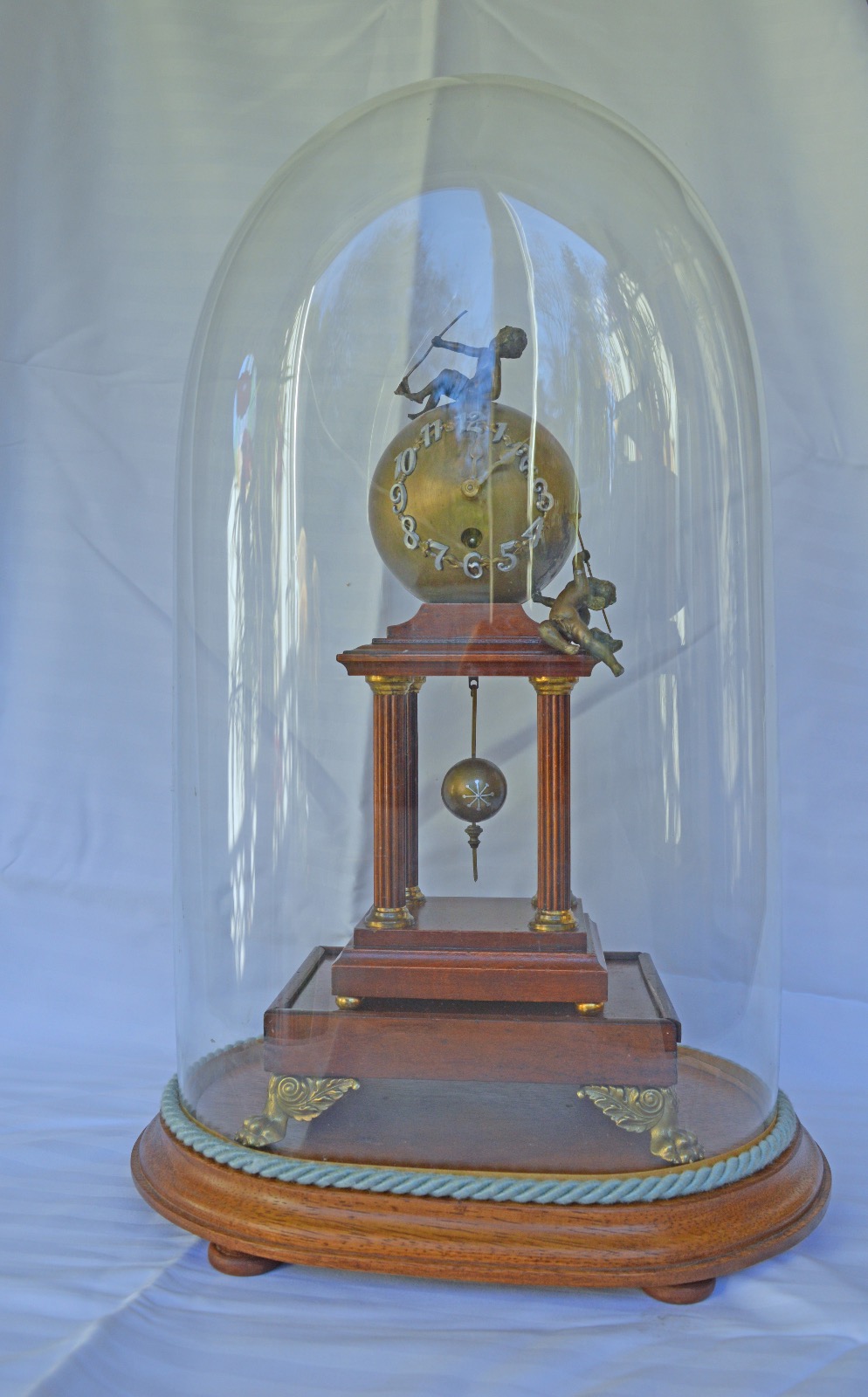 This is a rare unusual Edwardian antique spherical portico clock under a glass dome. The clock is in great condition with a single train Junghans movement and fancy ball pendulum with spherical dial standing on reeded mahogany pillars and brass claw feet.