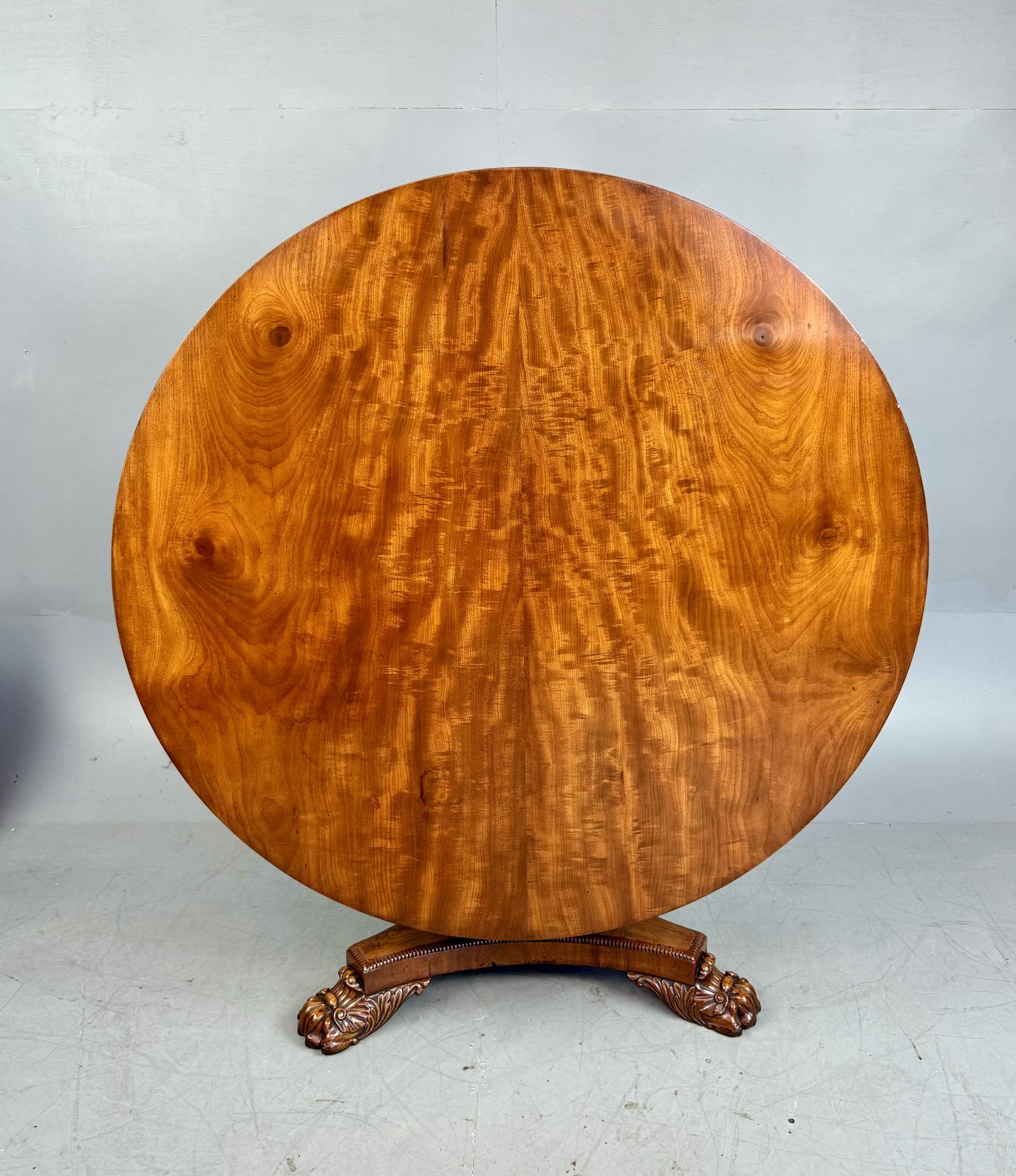 Fine quality late Regency mahogany centre/dining table circa 1820. The table is a good size(51 inches diameter) that will seat six comfortably for dining. It has a fantastic grain and colour. The triform base has very fine carved paw feet standing on hidden castors.