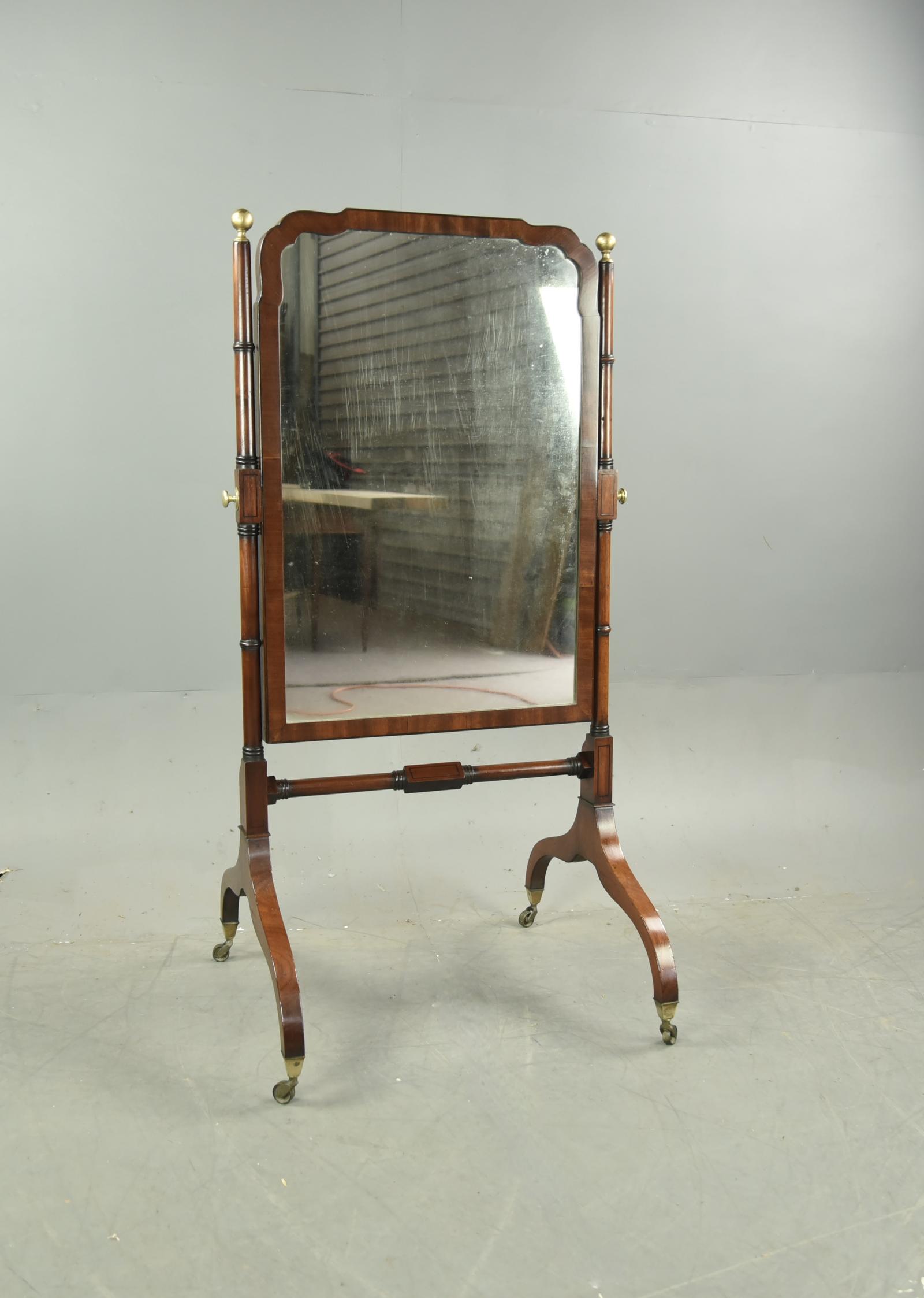 Fine quality early 19th Cemtury Regency antique mahogany cheval dressing mirror. The frame is in great condition a great colour and stands very elegantly typical of the Regency period. It stands on original brass castors. The original mirror plate does have some light fogging but still gives good reflection and gives it wonderful character.