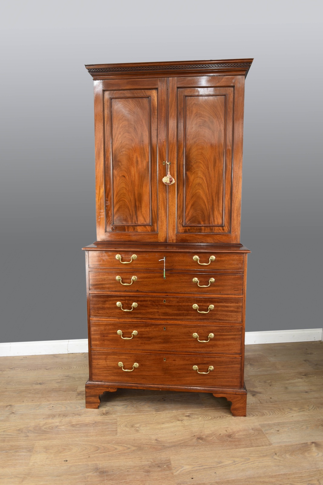 This is a fine quality Regency mahogany secretaire bookcase which has a wonderful grain and very good colour the top has two adjustable shelves with two small drawers below with wonderful mahogany panelled doors with original lock and working key. The base has a fully fitted secretaire drawer with pull down front and green baize writing insert, below this three graduating drawers standing on bracket feet.