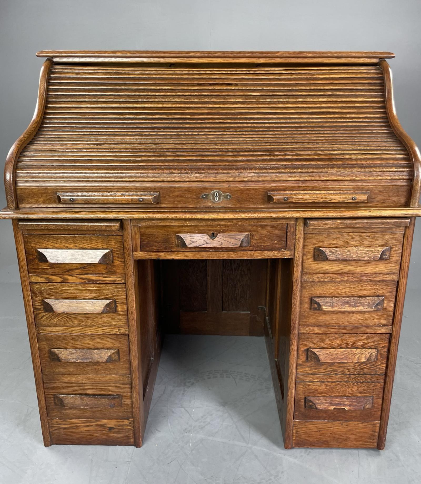 Fine quality medium sized oak roll top desk with s shape tambour front. The desk is in very good condition showing light signs of use. The tambour front runs smoothly as it should. It has original letter slot and has a working lock and key. When the tambour is closed it automatically locks all drawers. These unlock when the tambour top is pushed back to its furthest point. The lock plate is marked The Victorian desk warrented Scots manufacture.