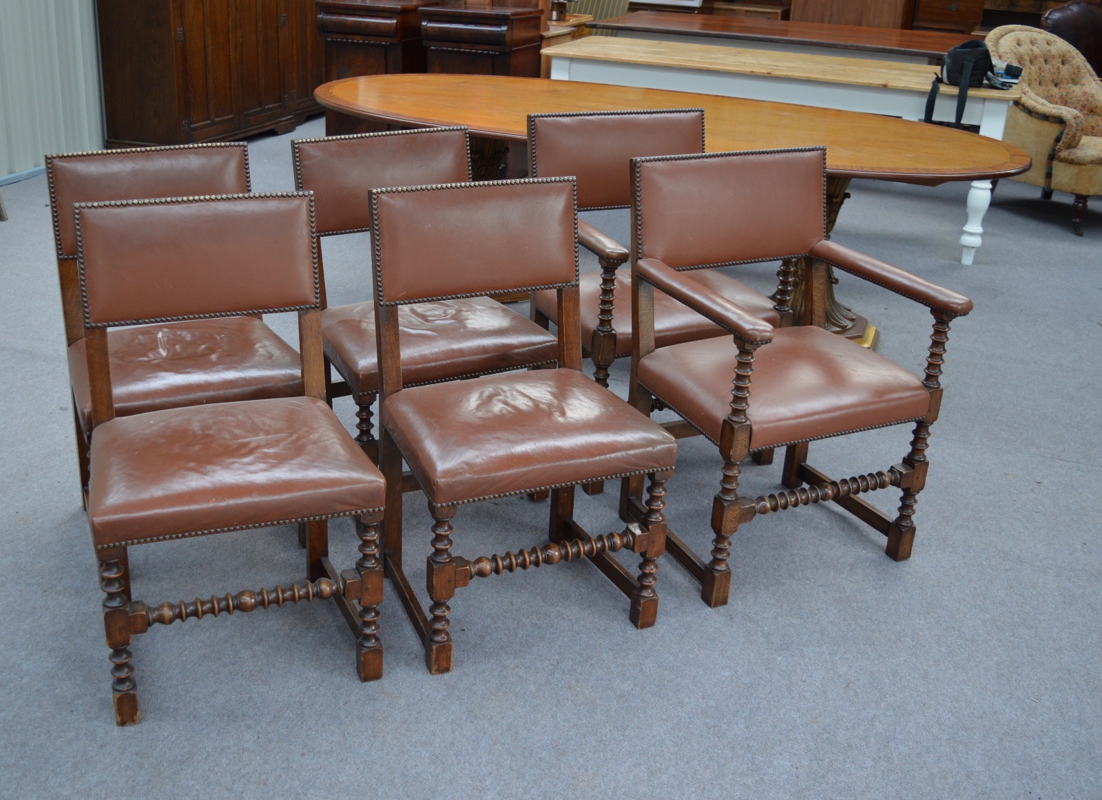 On offer for sale are these fine quality set of 6 oak Cromwellian style leather upholstered chairs. The chairs are all solid with no loose joints and are upholstered in a wonderful soft brown leather with brass studs ,the chairs have wonderful bobbin turn legs and are a great antique oak colour.