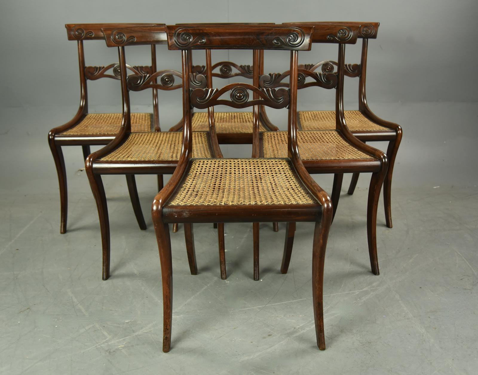 Fabulous set of six early 19th Century (c.1820) Regency antique rosewood dining chairs that are in very good condition and are all solid in joint. They are constructed of solid rosewood through out with well figured hand carved back rails. The cane seats are all in great un damaged condition and come complete with a quality set of swab cushions.
