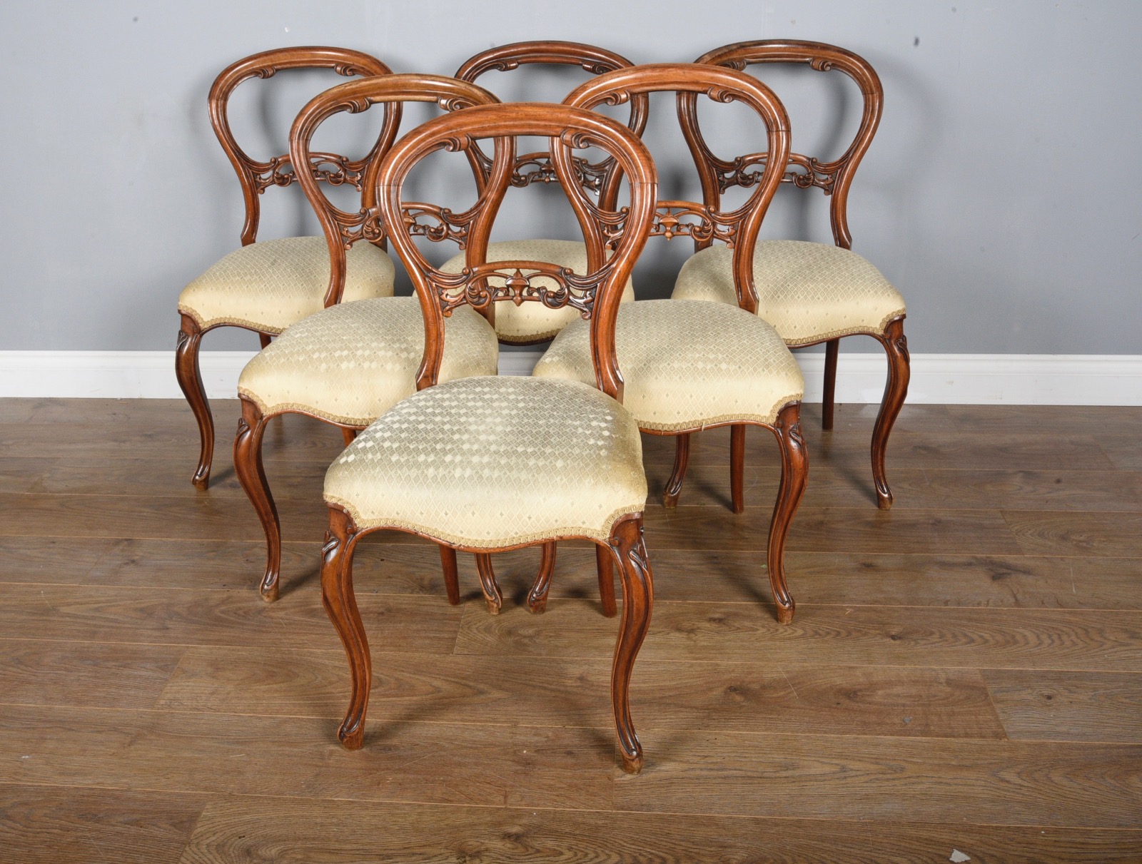 Fine set of 6 Victorian walnut dining chairs. The chair frames are in very good condition with no loose joints and no woodworm. There has been some minor restoration to the back of one chair. They do need recovering only as all the webbing and stuffing is in good condition. The upholstery suffered while in storage.