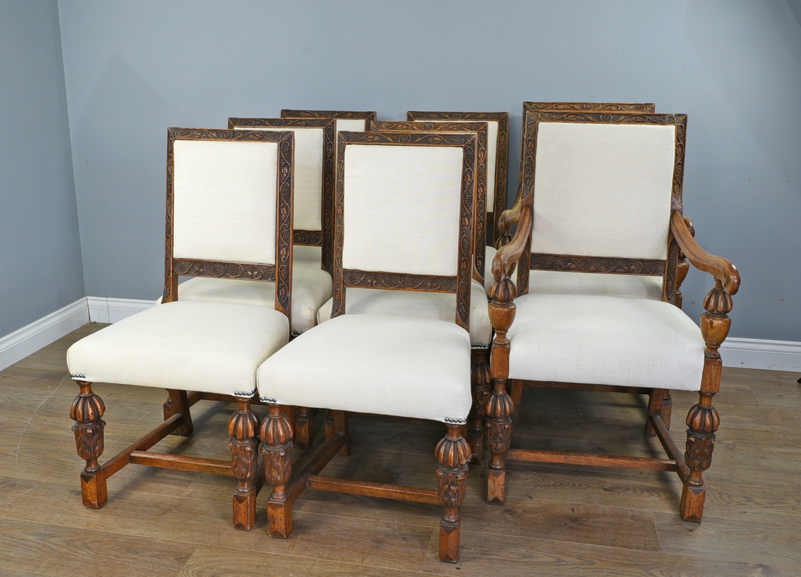 Fine set of eight hand carved solid oak chairs consisting of six single chairs and two large arm chairs. The chairs are in great solid condition with no loose joints , they have been recently upholstered in a heavy duty cloth that is also in good condition. They each have wonderful carved grape and vines to the backs with wonderful carved front legs ,they a wonderful golden oak colour.