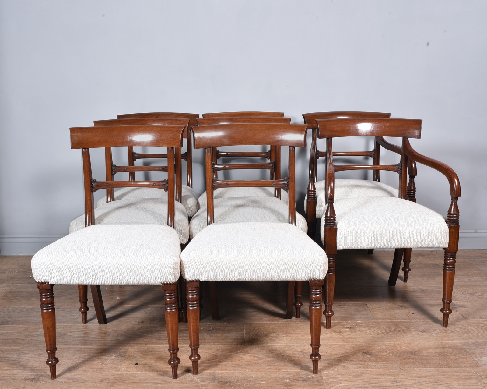 Fine set of eight late Regency period mahogany dining chairs in very good condition with no loose joints, fully refurbished with new upholstery, ready for their new home.