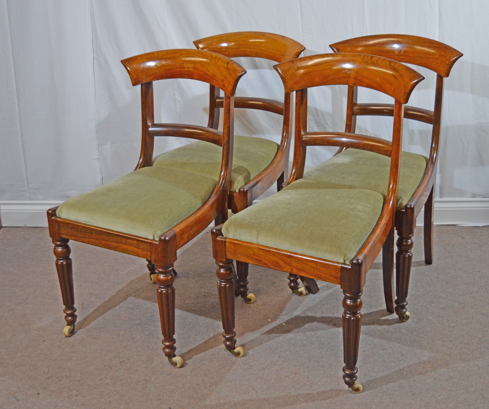 These are a good quality set of 4 William IV rosewood dining chairs which are in great condition and are very solid and woodworm free. They have wonderful grained solid rosewood backs with very sturdy reeded front legs terminating with original casters.