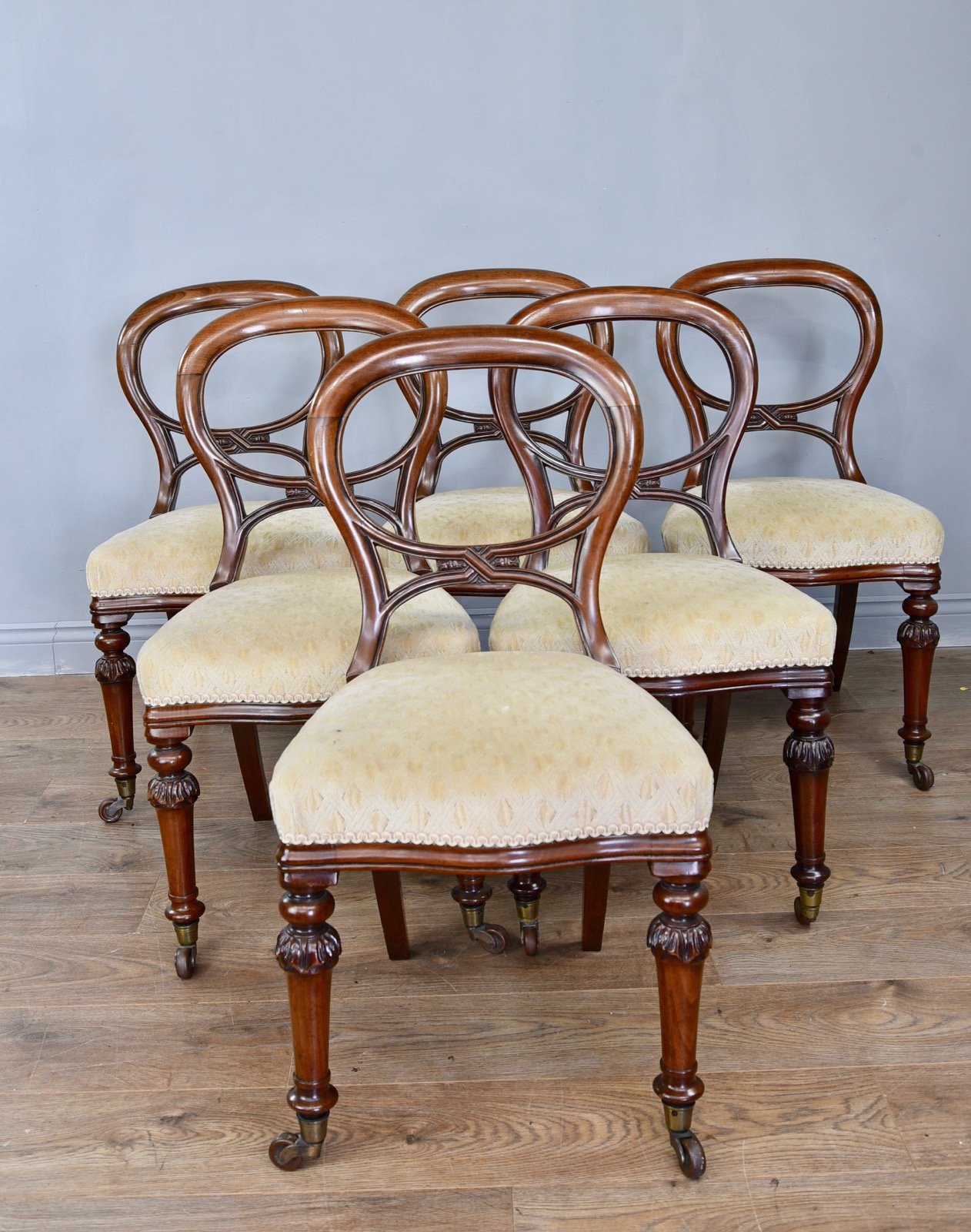 fine set of six Victorian mahogany dining chairs stamped H Slaughter. The chairs are very comfortable and a wonderful shape with fine carved turned front legs terminating in brass castors.