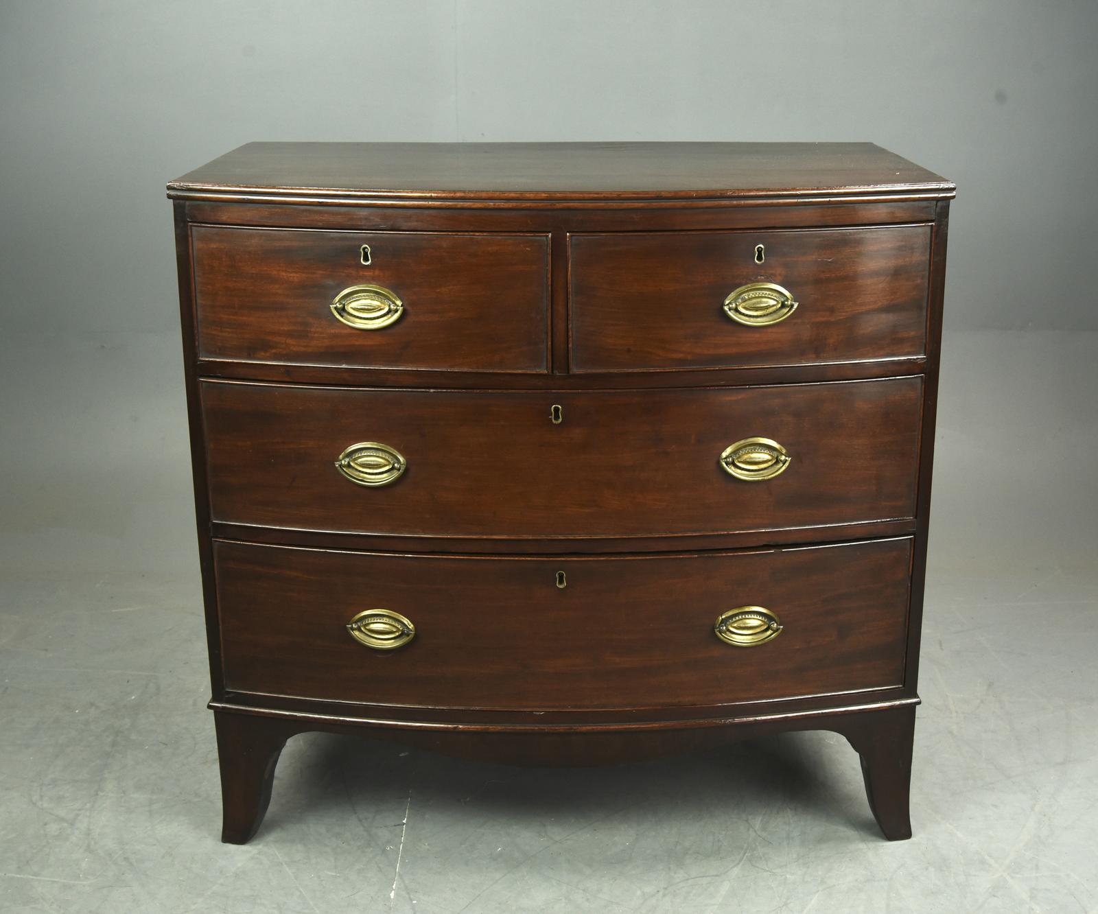 This is a wonderful small early 19th Century Georgian / Regency antique mahogany bow front chest of drawers consisting of two small drawers over two wide drawers. The chest is in very good original condition having been professionally cleaned and waxed to retain its wonderful antique patina. All the drawers slide nice and smooth as they should with oak linings and fine dovetail joints. It stands on splay feet.