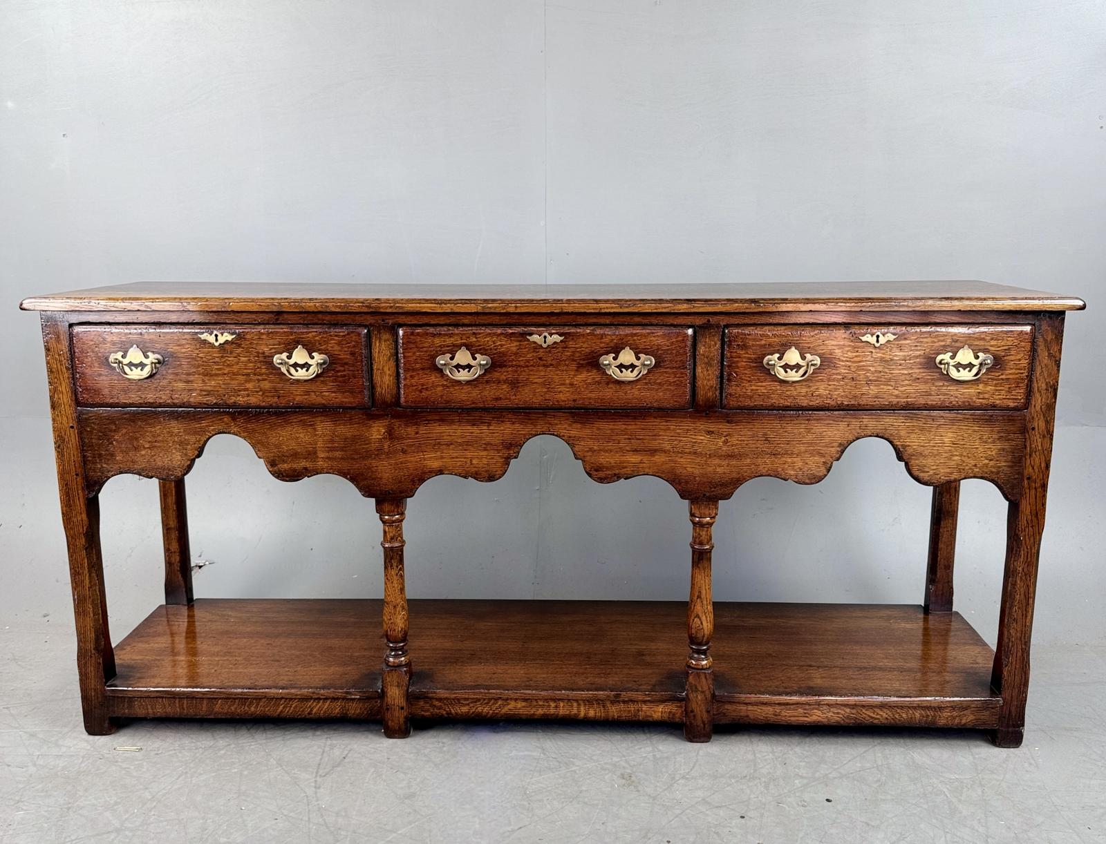 A classic South Wales leg dresser base made from fine English east Anglian oak model number Rl.18100 Yeomans dresser base ,the drawers with their double brass plate handles and matching escutcheons set above an attractive shaped apron raised upon four outer legs with chamfered details and two centre supports with baluster turnings ,with a useful pot board base . label attached