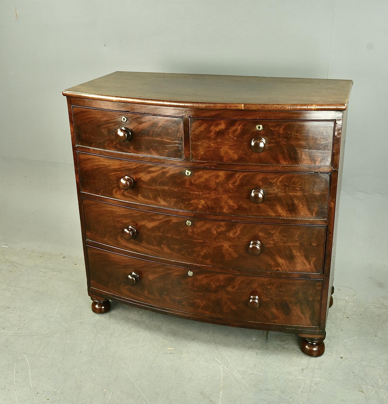 Good quality early Victorian antique flame mahogany bow front chest of drawers that has a great colour and wonderful grain with all original knob. The drawers all slide nice and smooth as they should and are wonderfully hand dovetailed and all joints are solid. This stunning chest is very well proportioned standing on original turned bun feet.