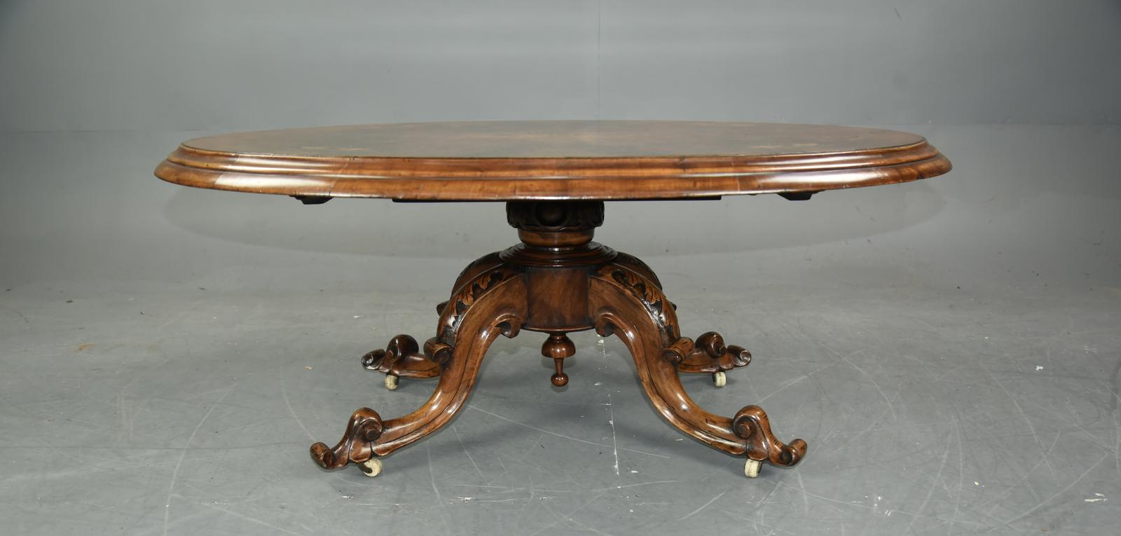 Fine Quality Victorian oval burr walnut coffee table. The top has wonderful figuring and a great colour with floral inlay detail. The base has four out swept carved legs stand on original porcelain and brass castors.