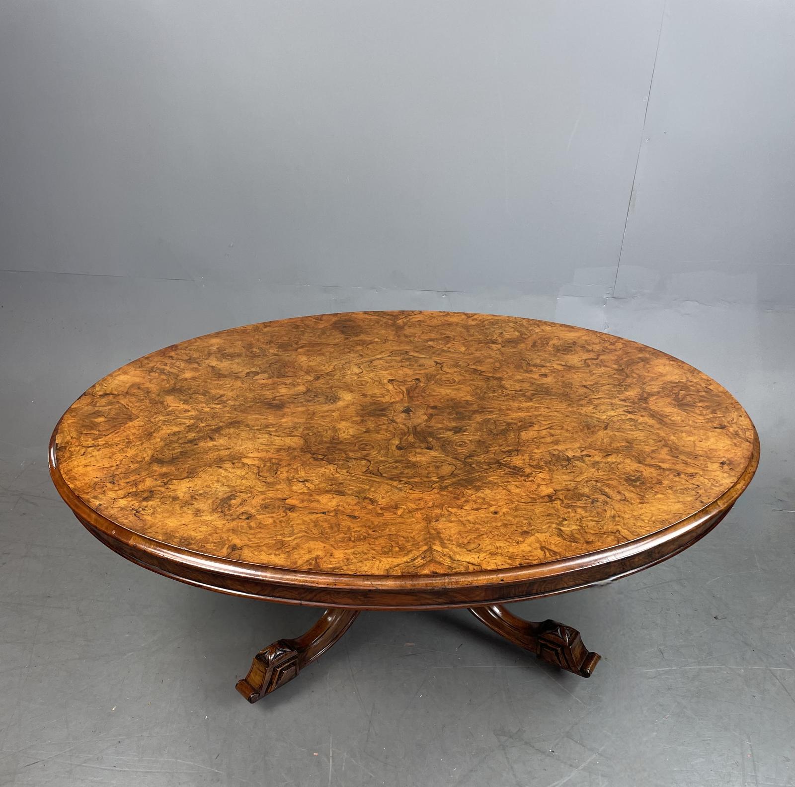 This is a wonderful 19th Century Victorian antique burr walnut coffee table that has an oval top with a fantastic burr grain and colour. The base has four ornate out swept legs and stands very solid. It is in great condition free from woodworm and ready for its new home.