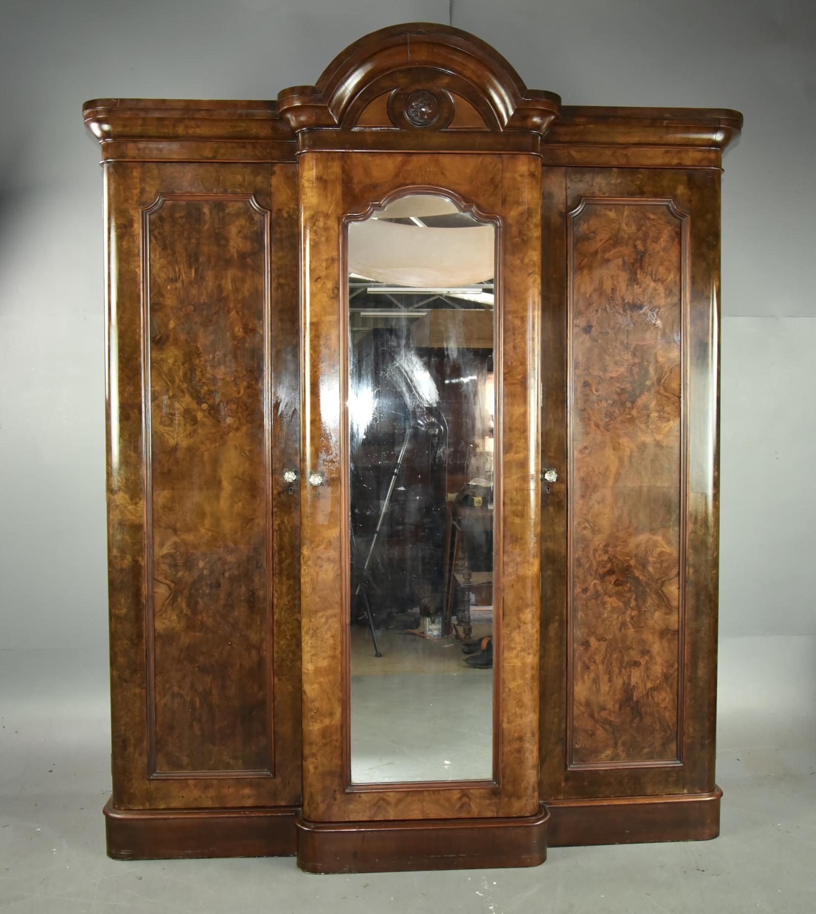 An impressive mid 19th Century Victorian antique triple wardrobe in beautifully figured burr walnut, showcasing rich colour and striking grain throughout. The central mirrored door is framed by an elegant arched pediment with carved cameo detail, giving the piece real presence.