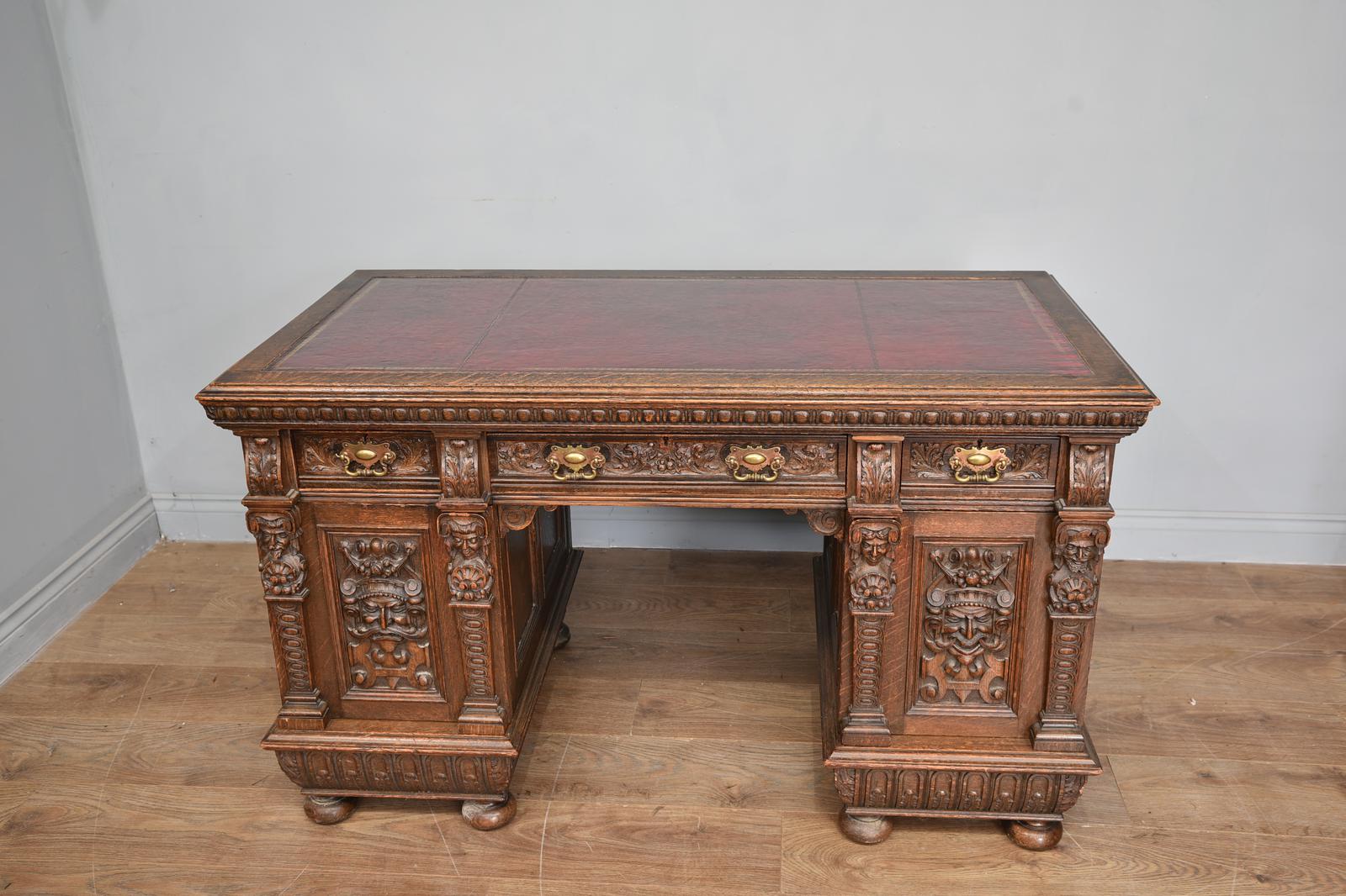 The desk has a maroon leather insert with gold tooling to the top with three drawers below , the left pedestal has slide out trays and the right pedestal has three drawers .