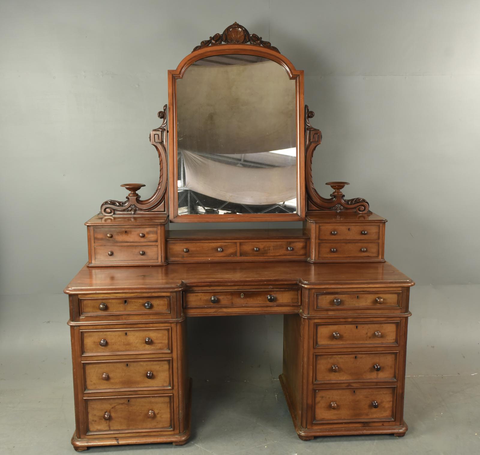 Good quality 19th Century Victorian antique solid mahogany dressing table which is in good original condition with lots of lived in character. The swivel mirror is supported by two finely carved columns with wonderful turned trinket trays each side. It is well fitted with five small drawers to the top and 9 further drawers to the base.