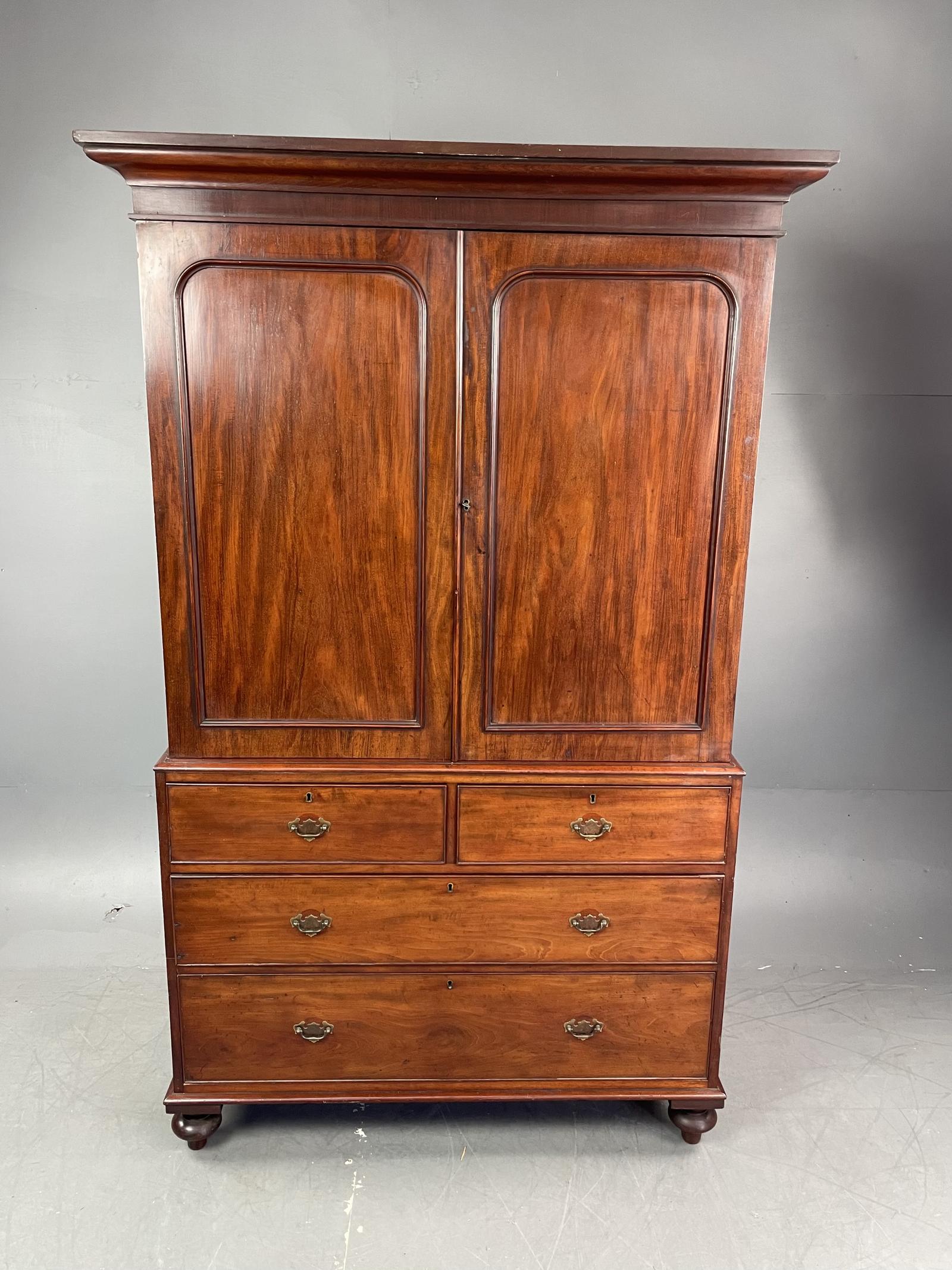 Good quality late 19th Century Victorian antique mahogany gentlemans wardrobe press cupboard. The wardrobe has a fitted interior with three side out trays to one side and hanging space the other giving ample depth to accommodate hangers front to back, below this there are for deep ash lined drawers providing very useful storage.