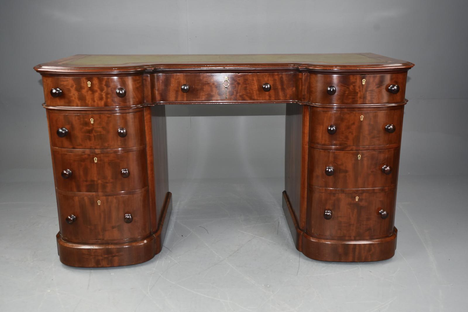 This is a fine quality 19th Century Victorian antique mahogany pedestal desk which have fine bow fronted pedestals with mahogany lined drawers. The top has a hand dyed leather insert with a fine cross banding detail. The desk is supplied with a single key.