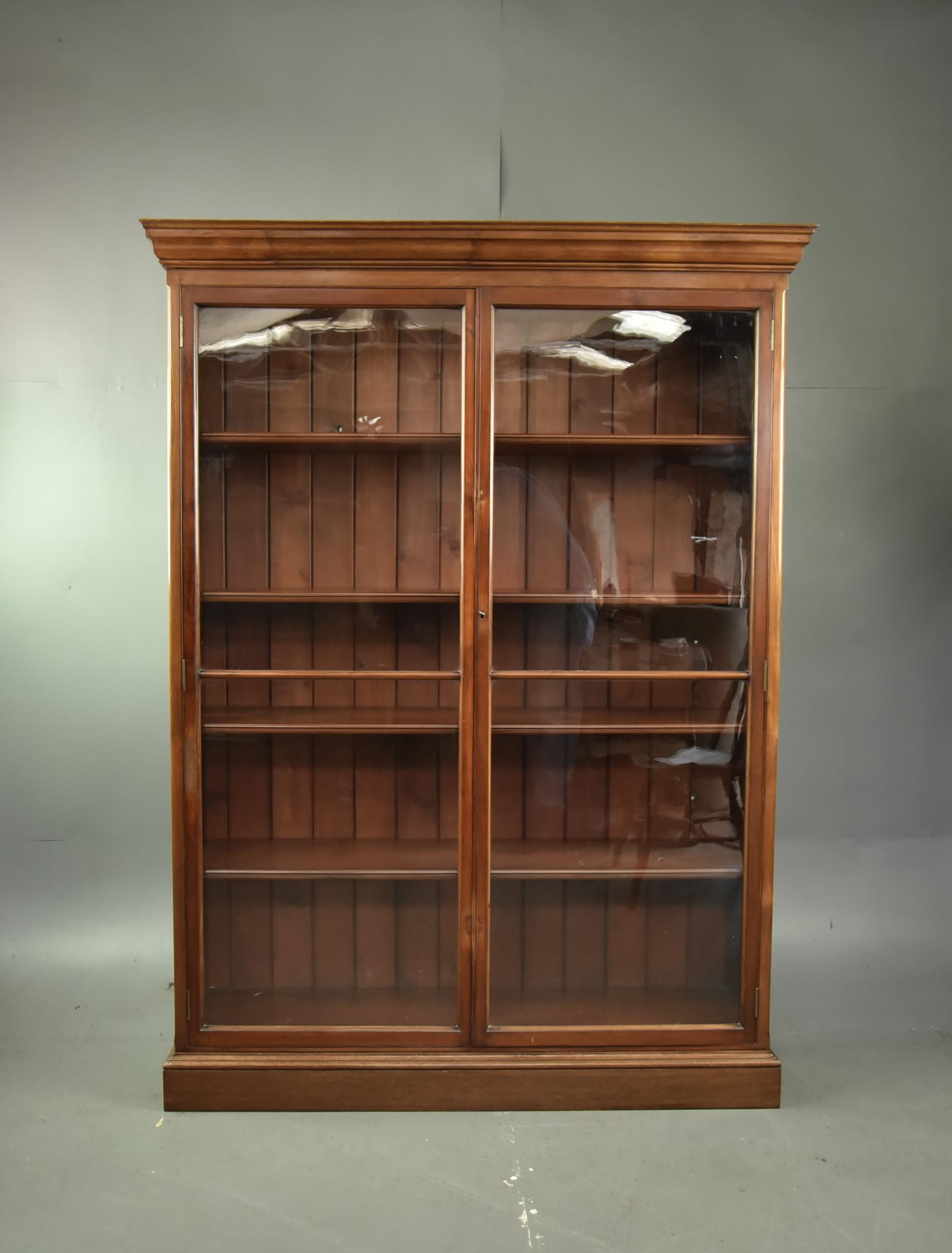 Constructed from rich, warm-toned mahogany, the piece showcases a beautifully proportioned form with a classic moulded cornice above a pair of glazed doors. The interior is fitted with four fully adjustable shelves, allowing for versatile display of antiques, collectibles, or retail items. The panelled back enhances its period character while providing a pleasing backdrop for displayed pieces.