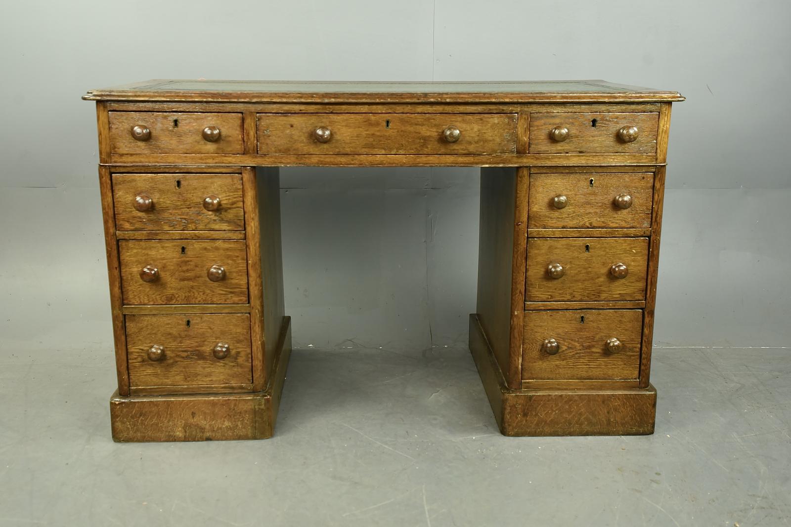 Late 19th Century (c.1880) Victorian antique oak pedestal desk which is in good used condition with a green leather insert with gold leaf tooling. The desk has 9 drawers that are all solid in joint and slide as they should (no keys).
