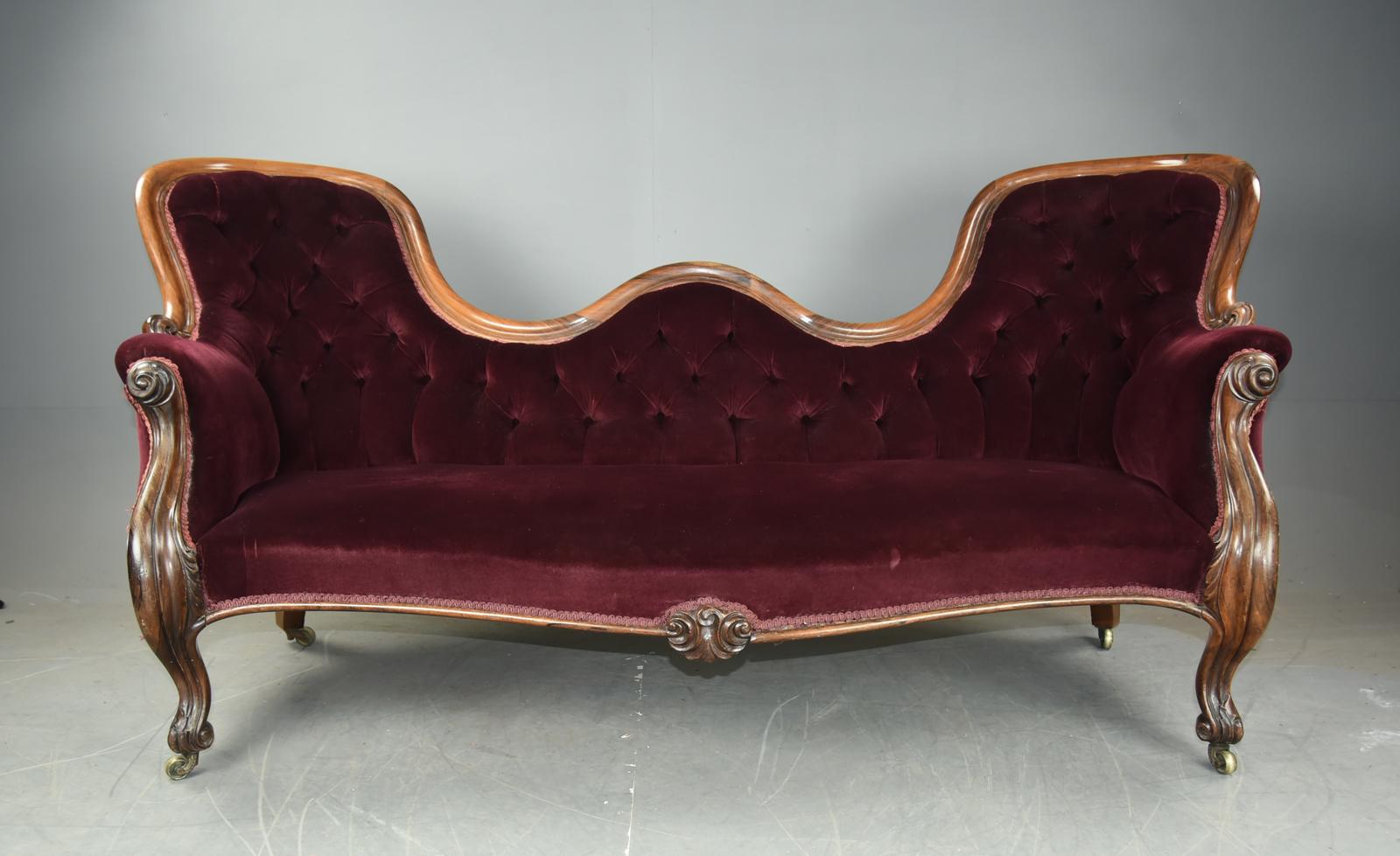 This is a superb quality antique rosewood Victorian double-ended upholstered settee, circa 1850. At this time, England was importing the best quality timber from its colonies. The frame and shaped legs are constructed of solid rosewood. The frame features attractive up-swept arms with a pretty shaped serpentine front and two lovely arched down swept double ends, with a wonderful show frame which stand on sturdy cabriole legs. The frame is upholstered in a plum draylon material and features a deep buttoned upholstered back. The couch has a firm sprung base. The settee seats 2 –4 persons. The upholstery is in good clean odour free condition.