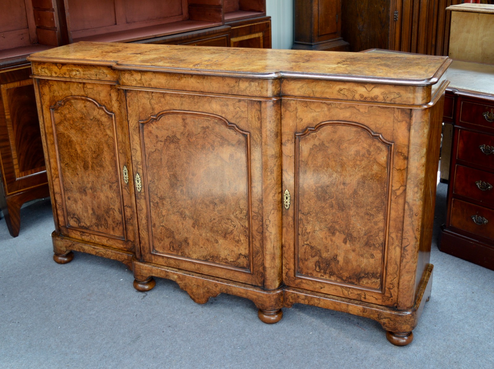 Mid 19th century Victorian 3 door breakfront cabinet /credenza in very good condition having been fully restored. It has a fine bur walnut grain and is a wonderful rich golden walnut colour all completely original it has three keys for all working locks.