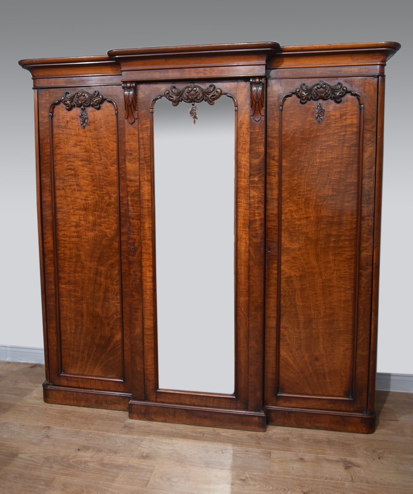 Fine quality early Victorian figured walnut breakfront wardrobe which has a fitted centre section with three drawers and slide out trays above, flanked by two hanging sections both fitted with hanging rail and hooks and have recently been paper lined. The wardrobe comes in three main sections for transport plus the cornice plinth base and all three doors are pin hinged ,with very easy re assembly.
