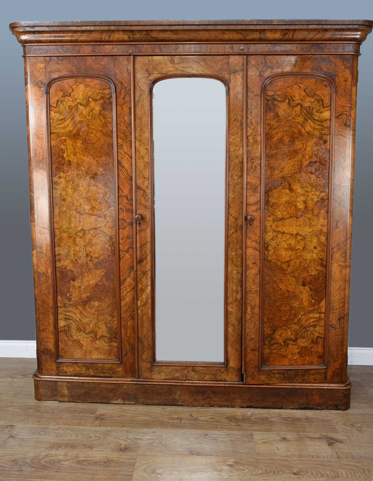 This is a fine quality 19th Century Victorian antique burr walnut triple wardrobe which has two hanging sections both fitted with left to right hanging rails the right hand side has shoe storage box to the bottom. The centre section is fitted with three drawers and four slide out trays.