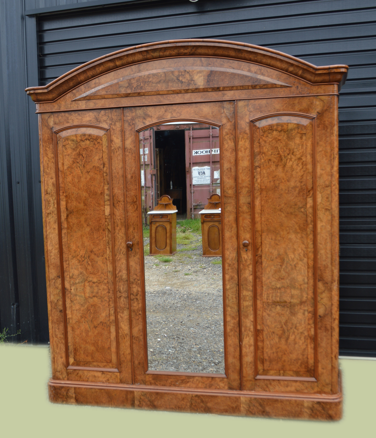On offer for sale is this very good quality 19th Century Victorian burr walnut wardrobe. This fine antique wardrobe has the desirable combination of two hanging sections and single fitted section with drawers and pull out shelves. The hanging sections have been recently relined in a printed cotton fabric. The wardrobe comes in 6 sections for transport these being the cornice base three main sections and the mirror door.